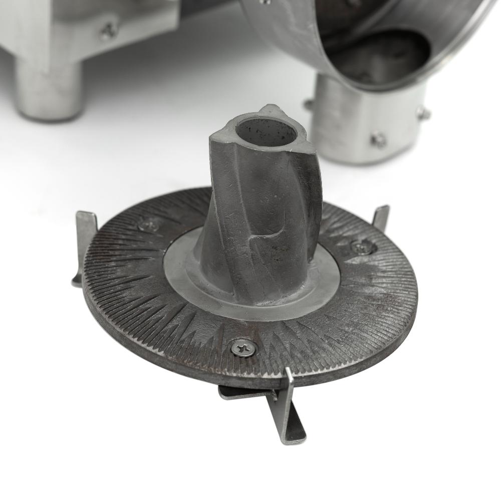 - Надёжные чугунные жернова и защита от металлических частиц. Рабочие диски изготовлены из литого чугуна, устойчивого к износу. Выходной патрубок оснащён четырьмя неодимовыми магнитами, которые улавливают случайные металлические включения, предотвращая попадание в готовый продукт.